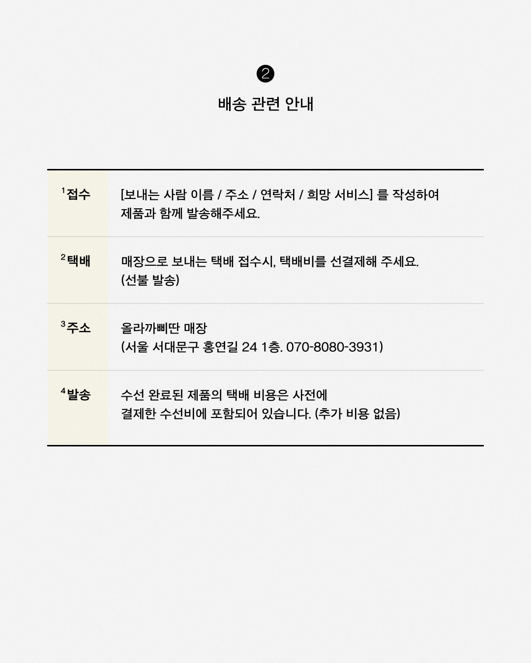 * 사전 문의 없이 임의로 배송된 건에 대해서는 교환/환불 처리가 되지 않습니다. 올라까삐딴 고객센터를 통해 꼭 상담 부탁드립니다.